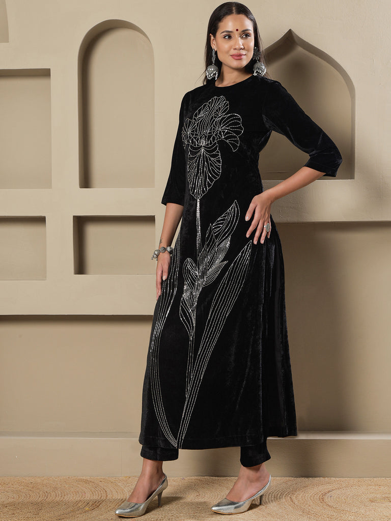 Black Velvet Handwork Long Straight Shirt With Pants-WRKS266