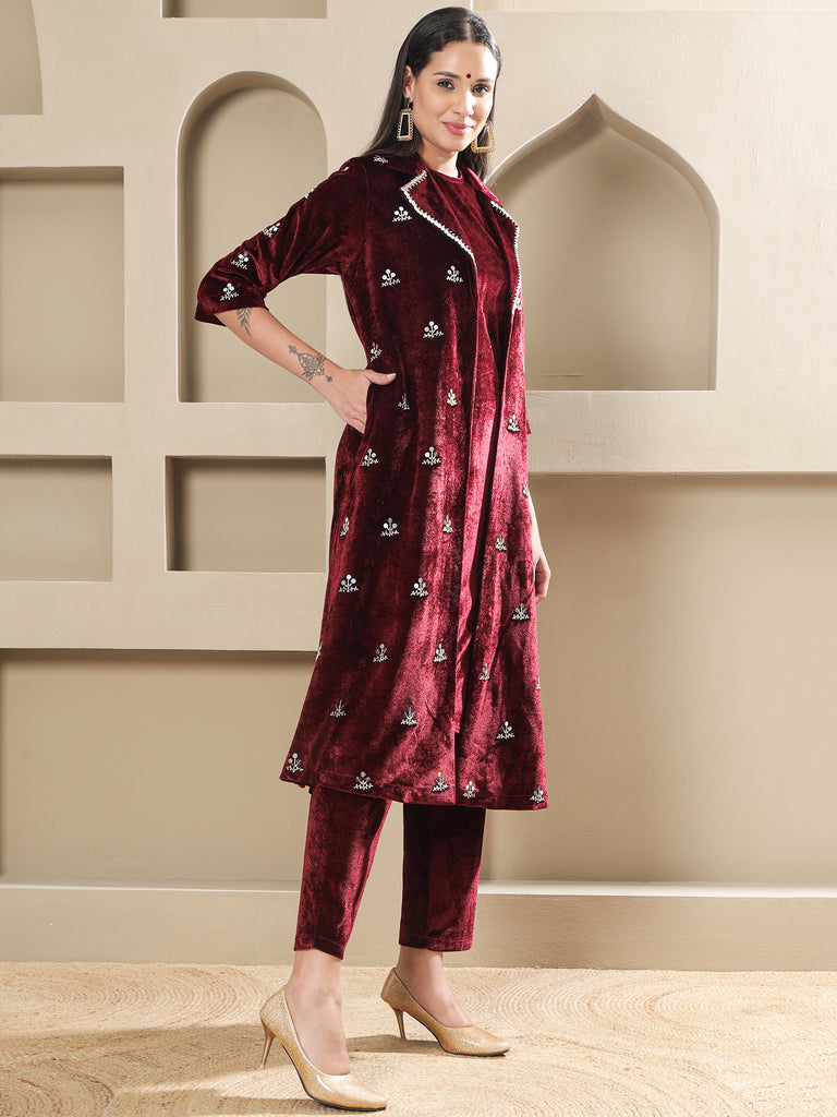 Maroon Velvet Hand-Embroidered Coat Set-WRKS264